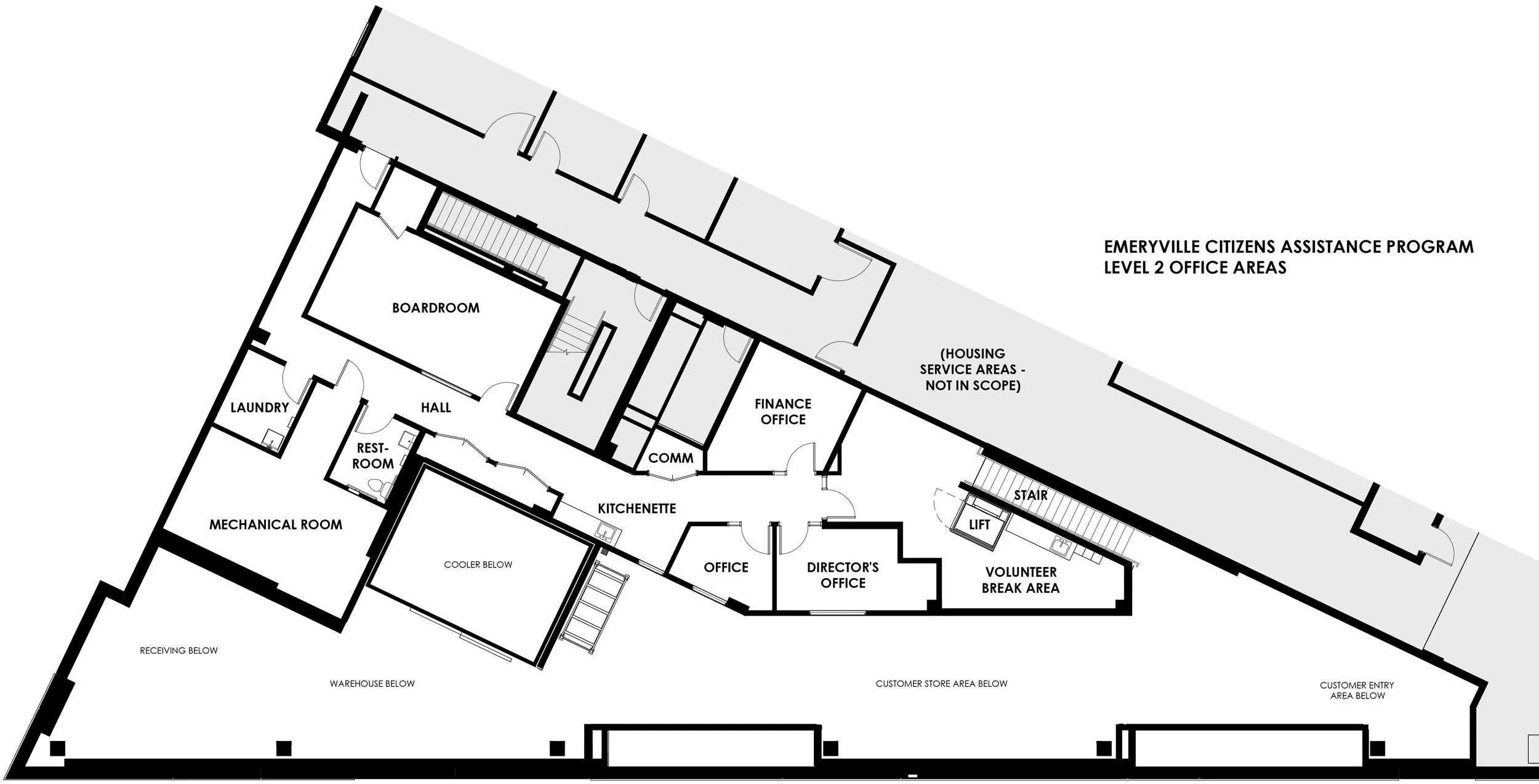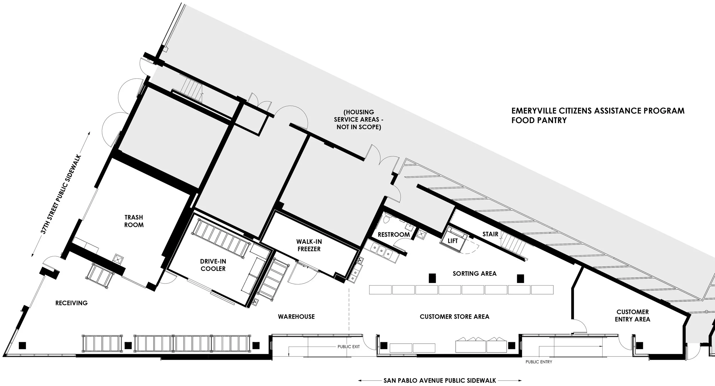 Since the 1970s, the Emeryville Citizen’s Assistance Program has provided grass-roots nutrition in the form of fresh donated food to all comers. Its longtime base of operations at San Pablo Avenue and 36th Street was developed into a mixed-use building offering many units of affordable housing, and the developer Resources for Community Development (RCD) offered the ground floor tenant space to ECAP for its future operations. After a period of pro-bono design services to ECAP, FOG Studio was offered the commission for full tenant improvement design services to be contracted directly under RCD.